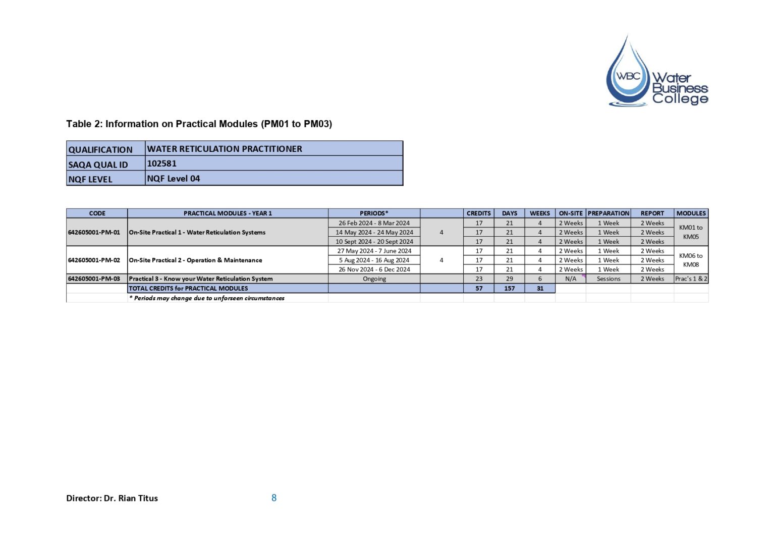 The practical modules will be scheduled and offered in-person at a practical site. The in-person and full-time attendance of two, 2 week practical sessions at a venue determined by WBC is compulsory. Each practical programme requires a minimum of 1 week preparation (prior to attending the 2 week practical session) as well as 2 weeks allocated to report writing (after attending the 2 week practical session). ‘Practical 3 – Know your Water Reticulation System’ will take the form of a comprehensive assignment developed by WBC specific to the learner’s profile.